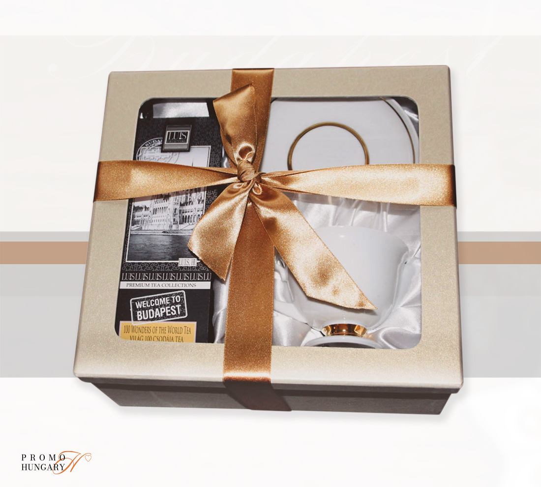 Elegáns Hollóházi porcelán teás csésze arany díszítéssel, plusz porcelán csészealj, Welcome to Budapest teával (80g), választható színű arany vagy fekete díszdobozban arany színű vagy nemzeti színű szatén szalaggal átkötve.