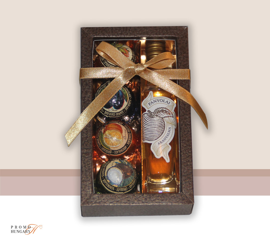 Panyolai Aranyalma pálinka különböző ízű Szamos Marcipán golyókkal kiegészítve barna díszdobozban, arany szalaggal átkötve